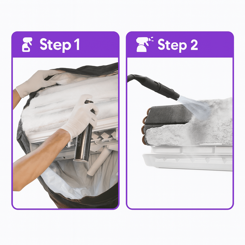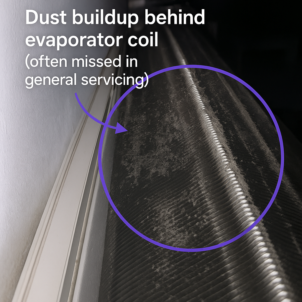 General servicing typically involves cleaning the air filters and wiping the front surface of the evaporator coil. However, the real dirt and grime accumulate at the back of the evaporator coil, where traditional methods don’t reach. This hidden buildup reduces cooling efficiency, increases energy consumption, and shortens the lifespan of your aircon.